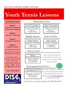 Duluth Indoor Sports Center is the area’s only indoor tennis facility and is the home of the University of Minnesota- Duluth and the College of St. Scholastica tennis programs. The facility features 4 indoor courts. Training opportunities are available for individual or small group lessons with one of our many highly qualified instructors. There also are several instructional programs for youth tennis players and competitive leagues for adults.